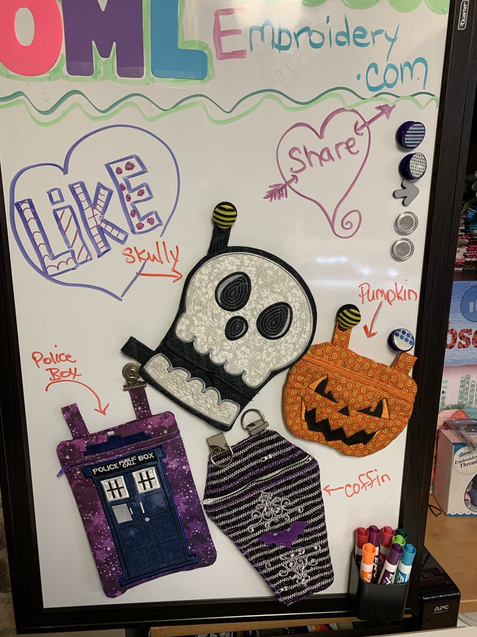The file includes a PDF with instructions and lots of pictures showing you how to stitch out the police box zipper bag and includes tips and tricks for perfect zipper placement and adding a lining so your skull bag is complete with no raw seams showing!